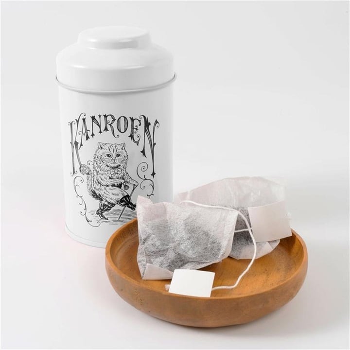 猫のイラスト缶に入った、ほうじ茶ティーバッグ。