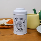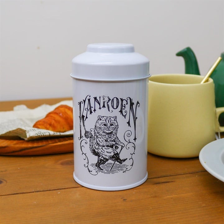 ころんとした白い缶に描かれた、少し不思議でかわいい猫。